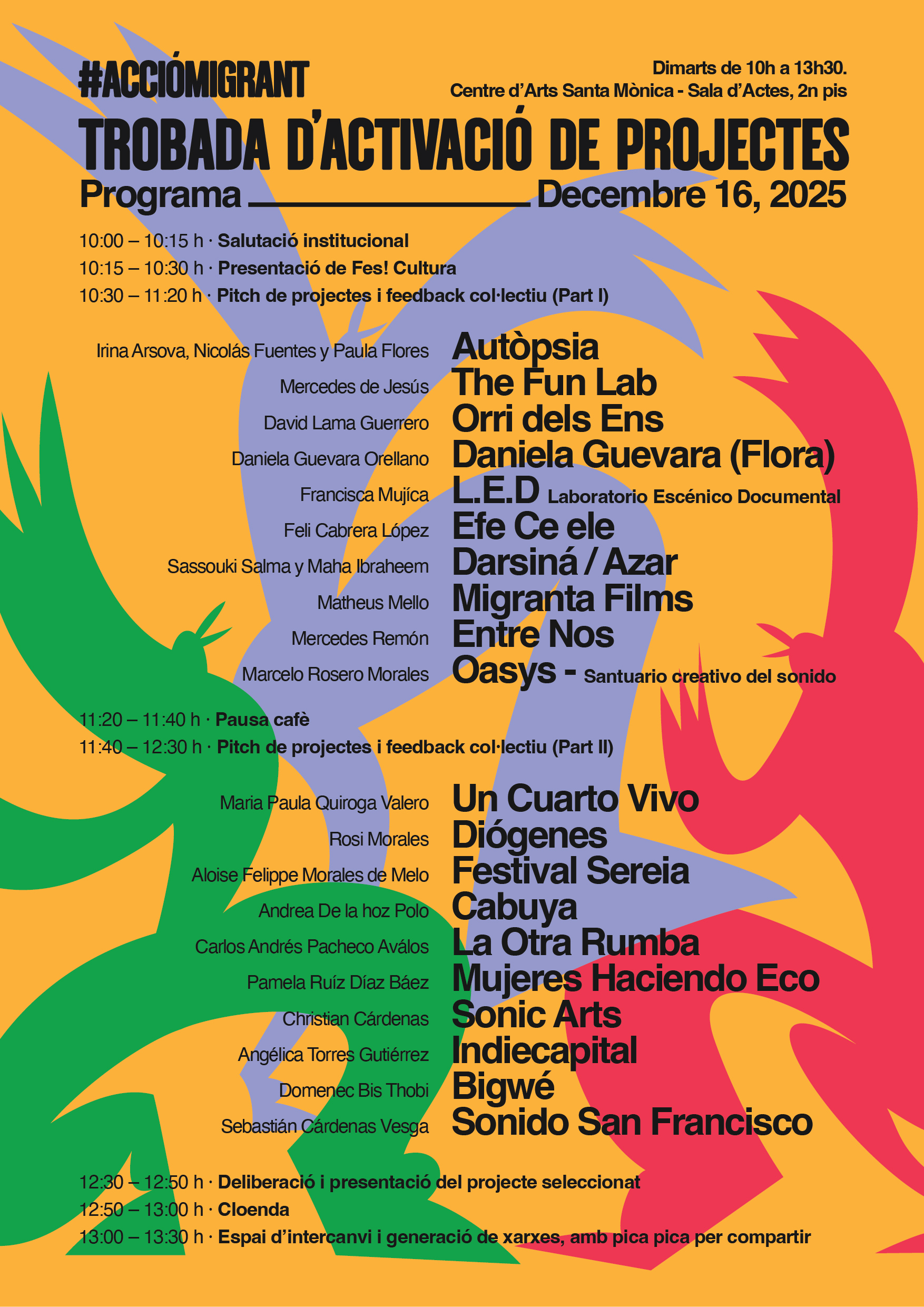 Este año presentamos una formación modular orientada a la capacitación de artistas y agentes culturales de diversos orígenes, con el objetivo de reforzar sus competencias profesionales, facilitar su inserción en el ecosistema cultural local y promover modelos sostenibles de desarrollo cultural. El itinerario ofrece herramientas prácticas para diseñar, financiar y gestionar proyectos culturales con impacto. La formación combina enfoques de derechos culturales con estrategias de sostenibilidad económica, visibilidad y profesionalización, para fortalecer el rol de los agentes culturales migrados y racializados como actores clave en el tejido cultural catalán.